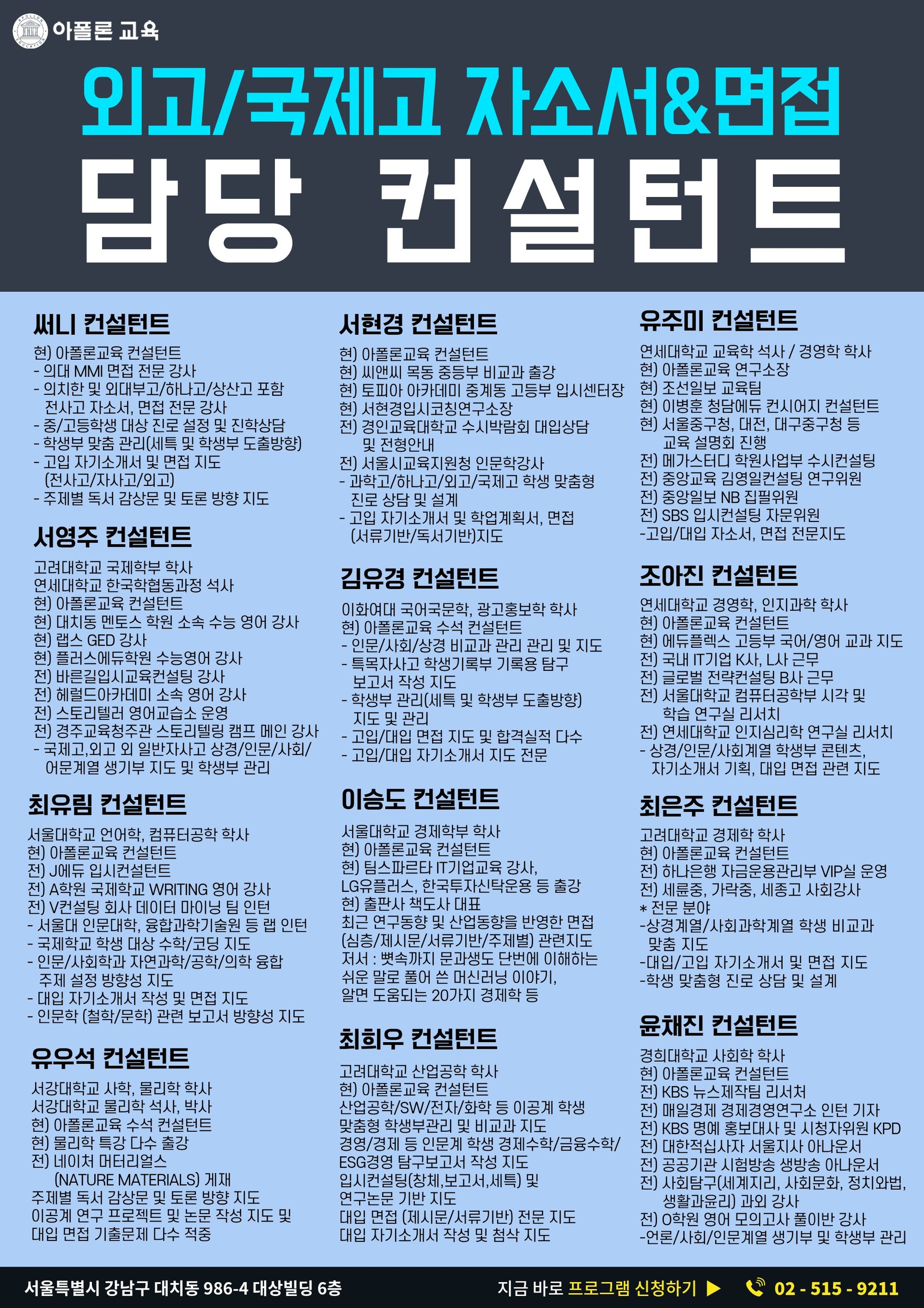 (주)아폴론교육 | 대표 : 신형섭 | 주소 : 서울특별시 강남구 대치동 986-4 (도곡로93길 9) 대상빌딩 6층